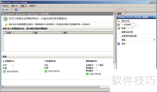 2、 打开Windows Server Backup程序,点击右侧操作菜单中的一次性备份图标即可启动备份操作。