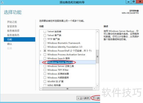 6、 勾选Windows Server Backup功能,然后点击下一步继续操作。