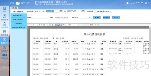 19、 提供收费明细、初复诊收入、项目分类、工作量及用量五大类数据统计,支持按时间、诊所名称、支付方式等条件自定义生成报表,可灵活导出为Excel文件并打印,便于全面掌握经营状况与业务动态。