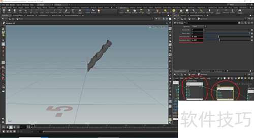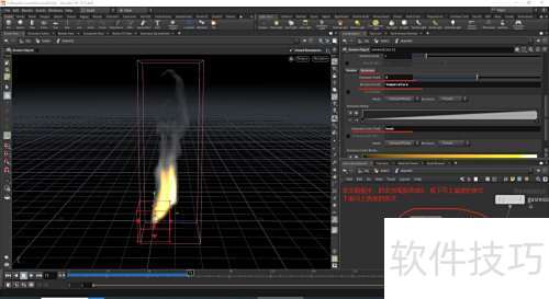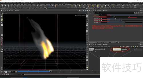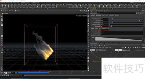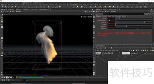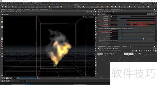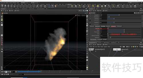 34、 新建gaswind节点并连接至pyrosolver节点,根据图示参数设置,调整为沿z轴方向施加风力效果。