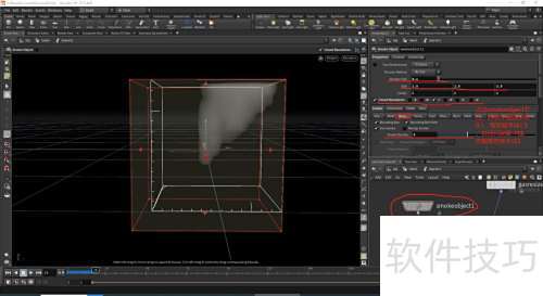 32、 在smokeobject节点的第二面板中,将密度参数设为烟雾,并将密度缩放调整为5。