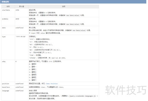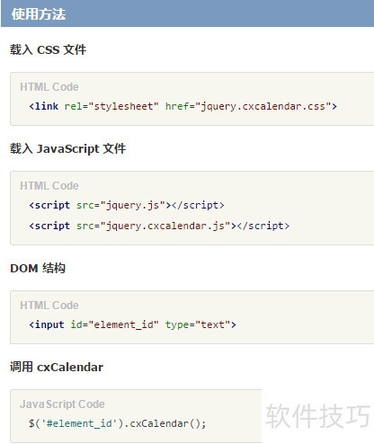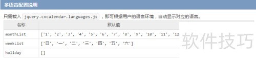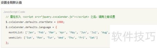 8、 在引入 jquery.cxcalendar.js 文件后、调用相关功能前,需先完成相应配置。