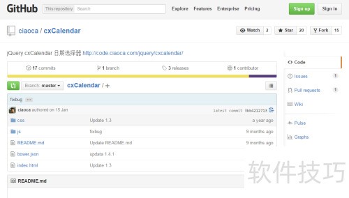 1、 前往 https://github.com/ciaoca/cxCalendar 页面,下载 cxCalendar 项目文件,操作方式所示。