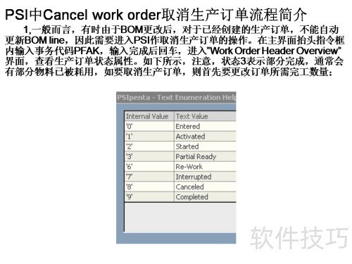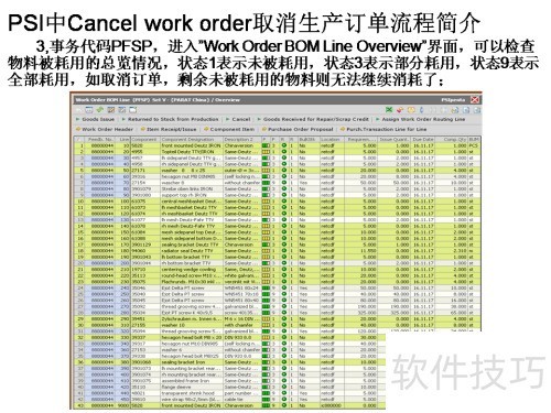 3、 通过事务代码PFSP进入工单BOM行项目概览界面,可查看物料消耗的整体情况。其中状态1代表未消耗,状态3为部分消耗,状态9为完全消耗。若取消工单,剩余未消耗的物料将无法再进行后续消耗处理。