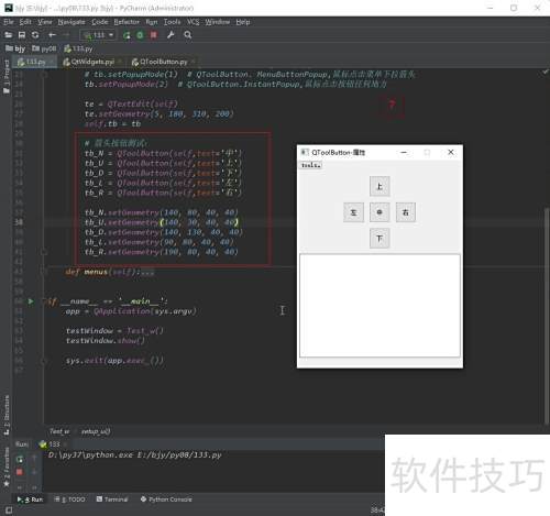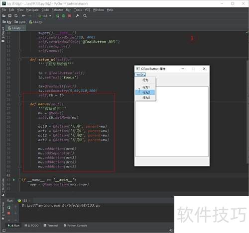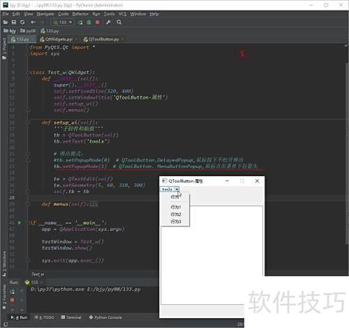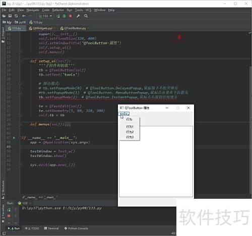 4、 通过调用工具按钮的 setPopupMode 方法,可设定菜单弹出模式,该方法接收一个表示弹出模式的参数对象,用于控制菜单的显示方式。