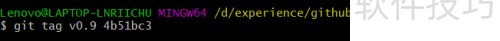 5、 使用git tag v0.9 4b51bc3命令可为之前的提交打上标签,其中v0.9为标签名称,4b51bc3是查找到的指定提交版本号,操作方式所示。此方法便于后续对特定版本进行快速定位和管理,是版本控制中常用的操作之一。