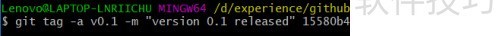 8、 可通过执行git tag -a v0.1 -m version 0.1 released 15580b4命令来创建带注释的标签,具体操作所示。