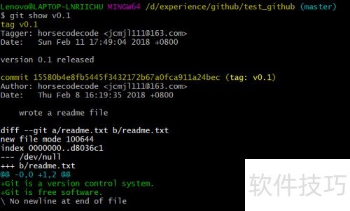 9、 通过执行git show v0.1命令,可查看此前创建标签时所附的详细说明信息,具体效果所示。