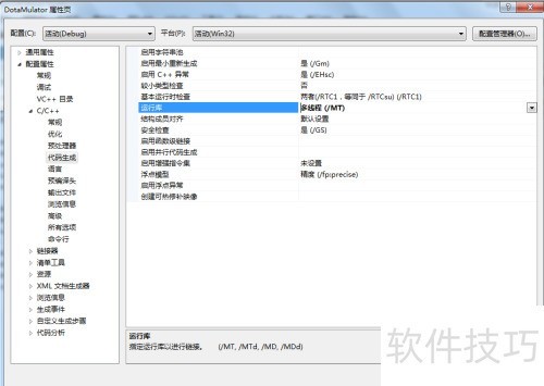 6、 右键项目属性,进入C/C++代码生成设置,将运行库改为多线程(/MT)选项。
