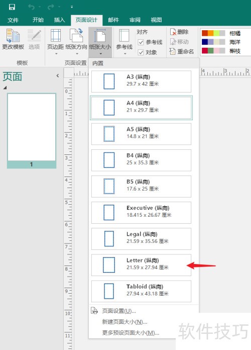3、 在纸张大小选项中选择纵向的letter尺寸。