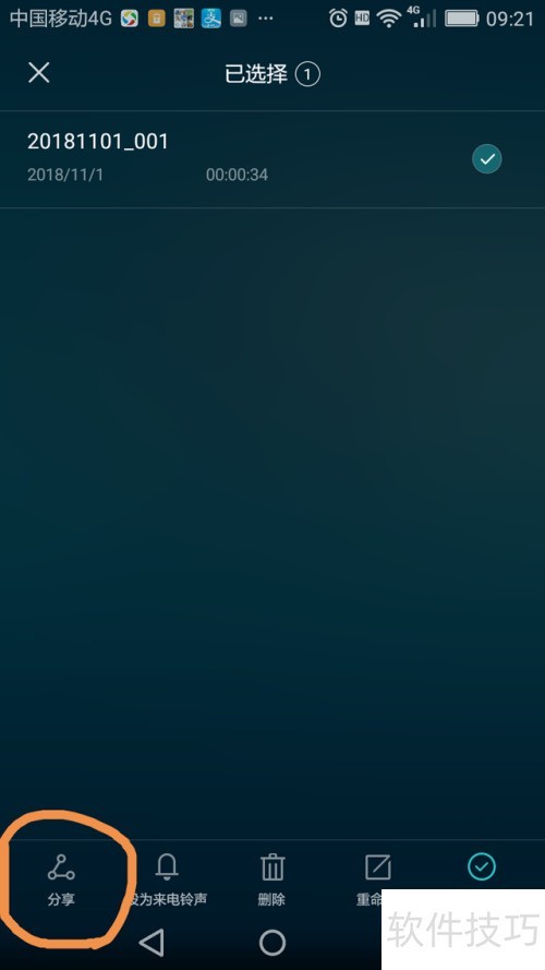 8、 长按音频文件,弹出对话框后,点击左下角的分享按钮即可完成分享操作。