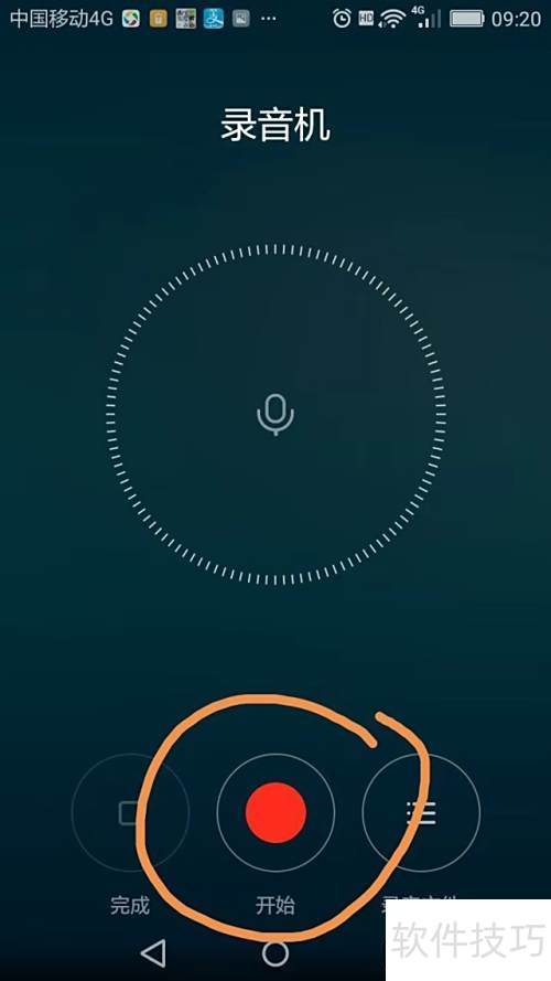4、 打开手机中的录音机应用,界面下方通常显示三个功能键:完成、开始及录音文件。中间的红色圆形按钮十分显眼,点击即可启动录音功能,随后开始讲话,录音便立即进行。
