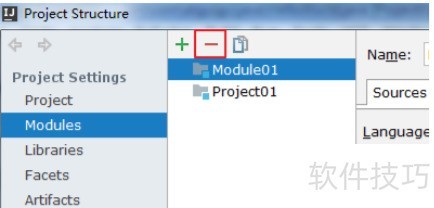7、 在Project Structure窗口中,选择需删除的模块名称,点击顶部的减号按钮即可移除,操作所示。