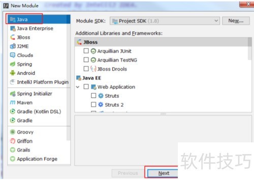3、 在弹出的新建模块窗口中,左侧选择Java选项,点击下一步按钮,操作所示。