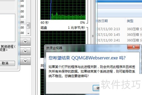 9、 勾选以QQMGBWebserver开头的线程后,系统会立即提示结束进程。此时点击结束进程按钮,很快会弹出一个确认窗口,询问是否终止该线程。只需在弹出的对话框中再次点击结束进程,即可完成操作。整个过程快速连续,注意按提示依次确认即可顺利完成终止。