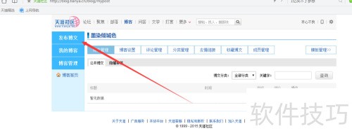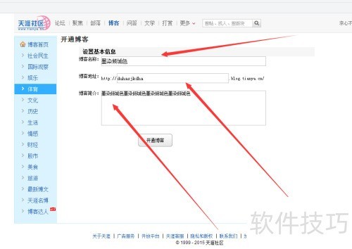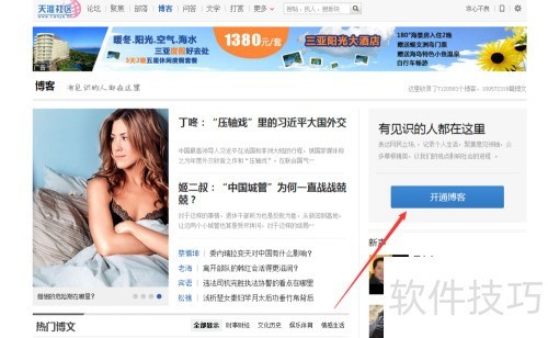 1、 进入后即为天涯博客页面,可见开通博客字样,具体位置见下图所示。