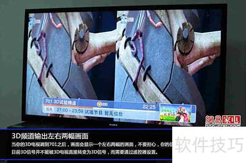 4、 第四步 电视将显示左右分割的双画面,因国内3D信号采用并排格式,屏幕同时呈现两幅图像以实现立体视觉效果。