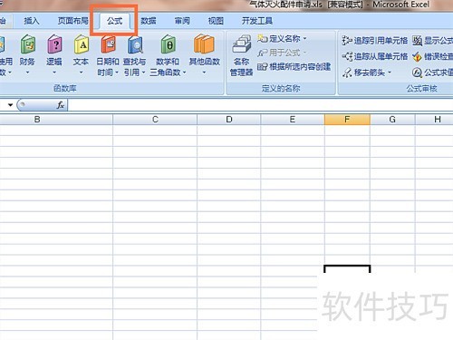 1、 打开Excel,点击公式选项,操作所示。
