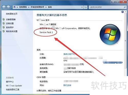 3、 若系统窗口未显示Service Pack 1,则表示尚未安装;若已显示,则说明该更新补丁已成功安装。可通过此信息判断系统更新状态。