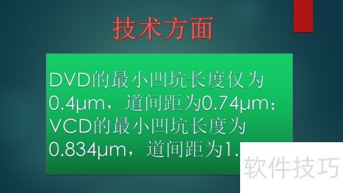 4、 DVD的最小凹坑长度为0.4微米,道间距0.74微米;而VCD的最小凹坑长度为0.834微米,道间距达1.6微米,可见DVD在存储密度上明显优于VCD。