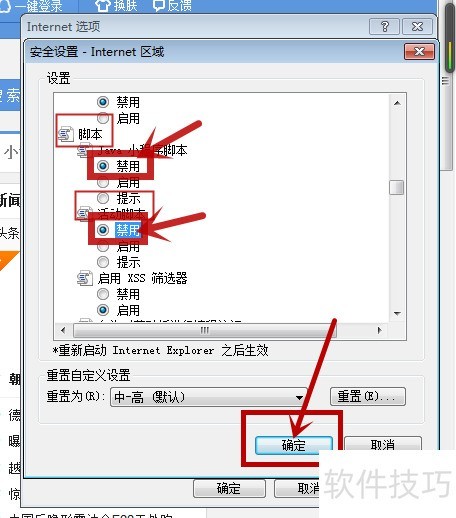 3、 在弹出窗口中向下滚动,找到脚本和活动脚本,将其设为禁用,然后点击确定完成设置。