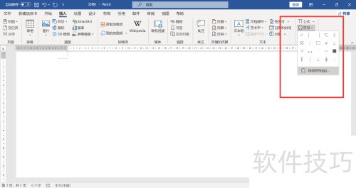 2、 在插入选项卡中点击右上角符号,下拉后选择其他符号即可。