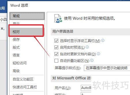 4、 点击选项按钮,进入Word选项对话框后选择校对功能。...