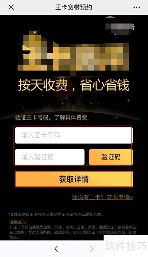 10、 打开王卡宽带预约页面,填写王卡号码,获取并输入验证码,点击获取详情,根据页面指引完成后续步骤。