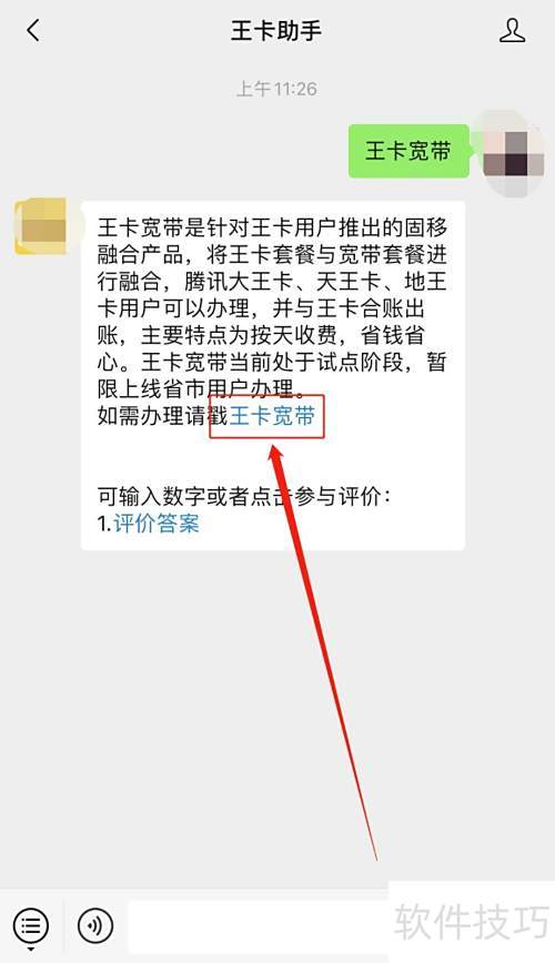 6、 关注王卡助手公众号,底部输入框回复王卡宽带即可。