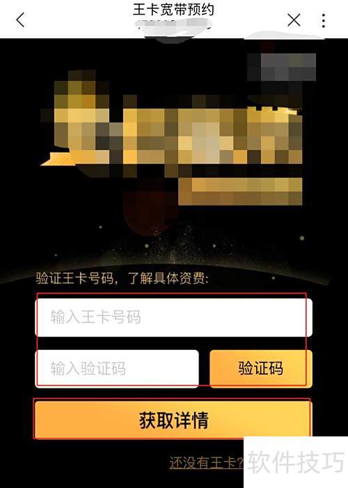 8、 打开王卡宽带预约页面,填写王卡号码,获取并输入验证码,点击获取详情,根据页面指引完成后续步骤。