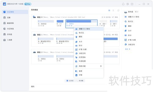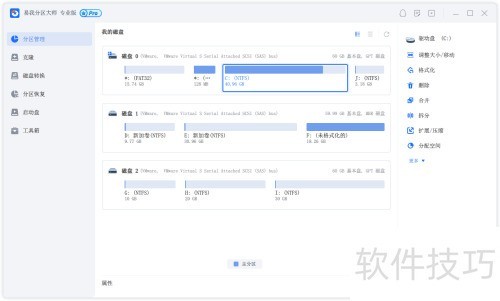 3、 缩小其他分区,释放未分配空间以扩展C盘容量。