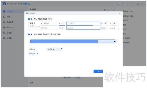 5、 将C盘相邻分区的末端拖动缩小,留出未分配空间,随后点击确定完成操作。