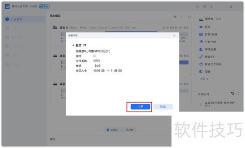 9、 点击执行操作按钮,软件将显示待处理任务,确认后点击应用即可完成C盘扩展。