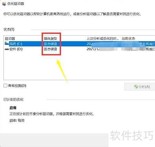 4、 进入优化界面后,在媒体类型中可查看硬盘类型,例如显示为固态硬盘,具体所示。