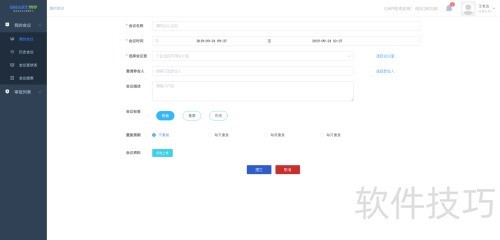5、 预约会议时,进入页面,点击,在弹出界面中准确填写相关信息。确认信息无误后,点击按钮,系统将自动通知所有参会人员。若管理员已启用审核机制,则需等待审核通过后,会议安排方可生效。整个流程简洁高效,便于会议组织与管理。