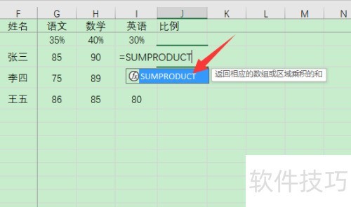 1、 在表格的空白单元格输入=SUMPRODUCT并双击以调用该函数。