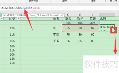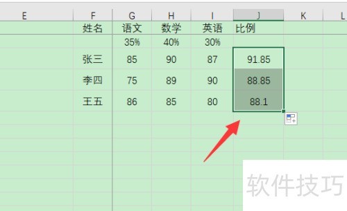 5、 将公式中加权比例的单元格范围用\$符号锁定,再将鼠标移至已计算加权平均分的单元格右下角,按住并向下拖动即可复制公式。