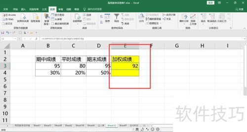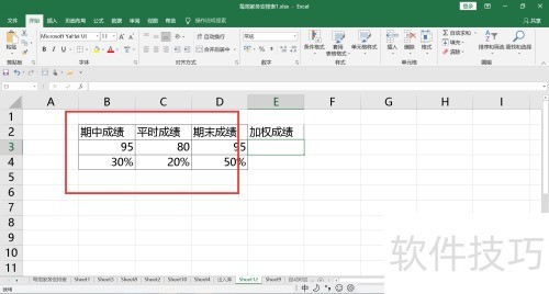3、 在加权成绩的单元格中输入公式=SUMPRODUCT(B3:D3,B4:D4)/SUM(B4:D4),用于计算各科目成绩与其对应权重乘积之和除以总权重。