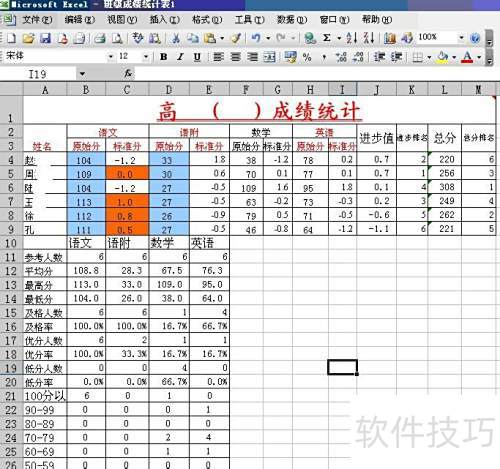 5、 制作成绩统计表,运用函数计算各项数据,方法简便,具体操作略去。