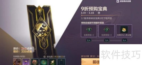 1、 新一期峡谷宝典预购将于3月21日至23日开启,活动期间购买普通版或精英版可享九折优惠,原价360点券现仅需320点券即可入手。
