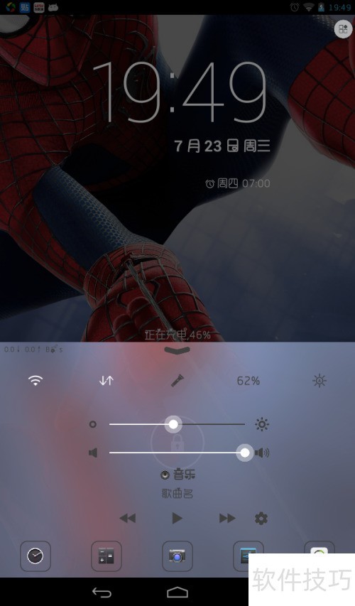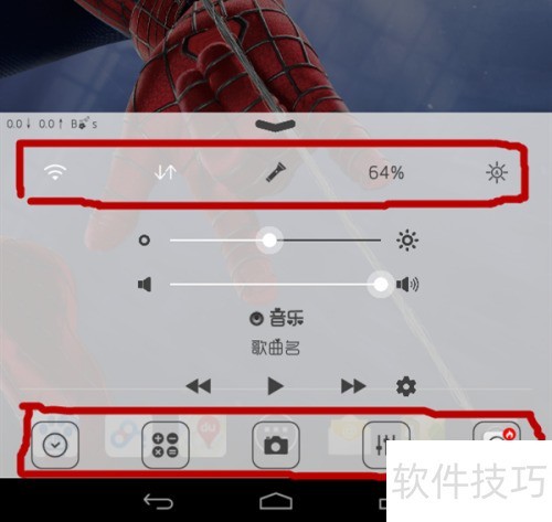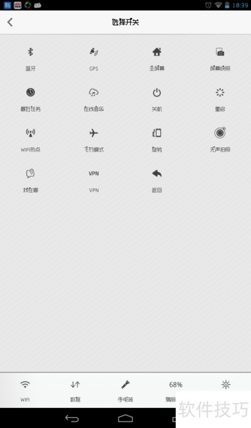 3、 顶部显示:Wi-Fi、移动数据、手电筒、清理内存、自动调节亮度功能。