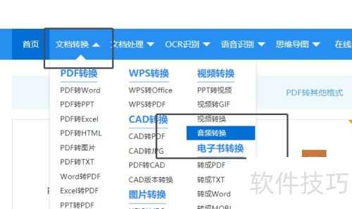 2、 搜索进入转换页面后,点击顶部文档转换选项,选择音频转换功能即可完成操作。