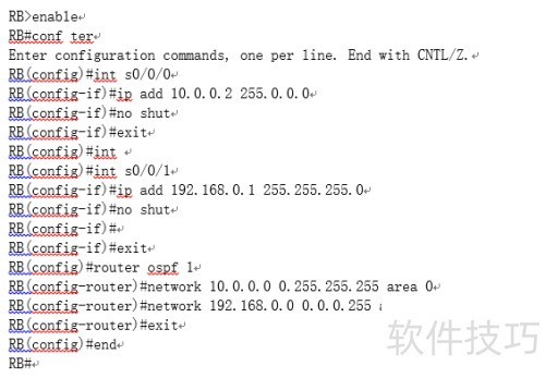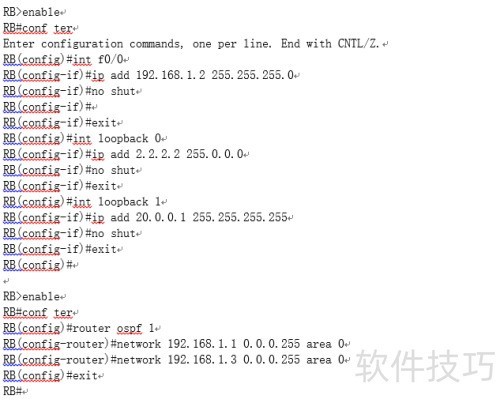 9、 配置路由器RB的快速以太网接口f0/0、环回接口L0和L1,并启用OSPF路由协议。