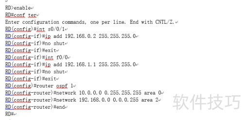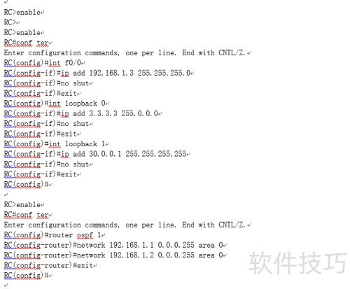 10、 配置路由器RC的快速以太网接口f0/0、环回接口L0与L1,以及OSPF路由协议。