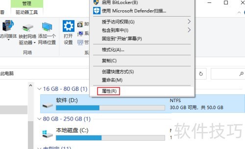 2、 在文件资源管理器中,右键点击目标驱动器,选择属性进行重命名操作。