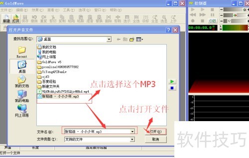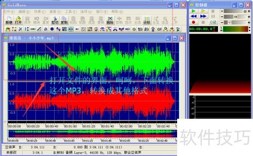 5、 重新熟悉软件界面,右侧控制器可忽略,对非专业人士而言并无必要。若你看到与我相同的画面,表明已正确打开需转换的MP3文件,准备就绪,可继续下一步操作。