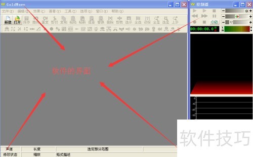 2、 启动GoldWave后,先了解基本界面,无需关注右侧控制器,重点熟悉顶部菜单栏和底部音频波形显示区域即可。