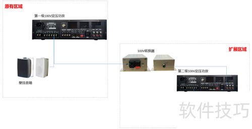 1、 将红黑端子按标识接入原功放的音频输出接口,RCA接口连接至扩展功放的RCA输入端,音量随原功放调节,调整至无失真状态即可正常使用。