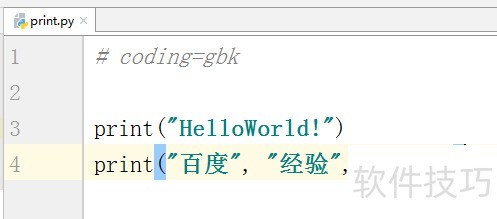 4、 演示 print 函数用法,输出字符串 HelloWorld!,具体代码见下图所示。