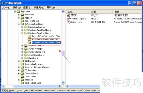 3、 打开注册表编辑器后,依次展开以下路径:HKEY_LOCAL_MACHINESOFTWAREMicrosoftWindowsCurrentVersionExplorerAutoplayHandlersContentTypeSniffersVideoFilesContentSniffer。该路径位于注册表的系统配置项中,主要用于管理视频文件类型的自动播放识别规则。进入该目录后,可查看或修改与视频文件关联的内容嗅探器设置,从而影响系统对视频格式的自动识别与处理行为。操作时需谨慎,避免误改关键项导致功能异常。